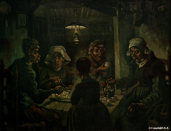 À cet effet, son tableau : Les Mangeurs de pommes de terre est un bel exemple qui propose une hagiographie moderne. Les personnages sont un composé des nombreux paysans qu’il avait observés avec tant de compassion pendant ses années de prédication, et dont il avait une grande admiration. Au moyen de couleurs sombres, il témoigne de la vie sinistre d’Êtres pour qui le dîner consiste à manger des pommes de terre bouillies. Par des détails tels que la faible lueur de la lampe; les mains noueuses usées par le travail; les traits rudes; l’expression des visages : l’inquiétude du fils, la tendresse de la jeune fille, la prévenance du père, le regard absorbé de la mère; il affirme une réalité dure mais profondément humaine. Il tente de représenter un monde où la communication est non verbale, et où la parole n’est que mensonge.