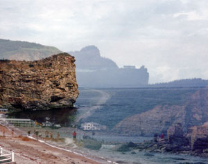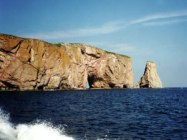 The Percé Rock is a monolith off the Gaspé Peninsula, 750 km east of Québec City. This limestone island-peninsula, once attached to the shoreline, is of an impressive size : 450 m long, 90 m wide and 85 m high. It can be reached at low tide. Its name derives from the fact that the sea has pierced holes in its structure to form archways. The Percé Rock is one of the major tourist attractions of Québec and Canada.