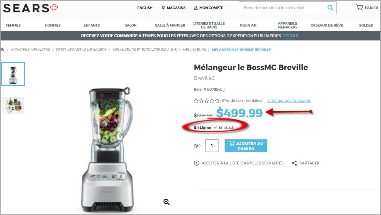 Page Web Sears Canada – Mélangeur Breville The Boss – En stock