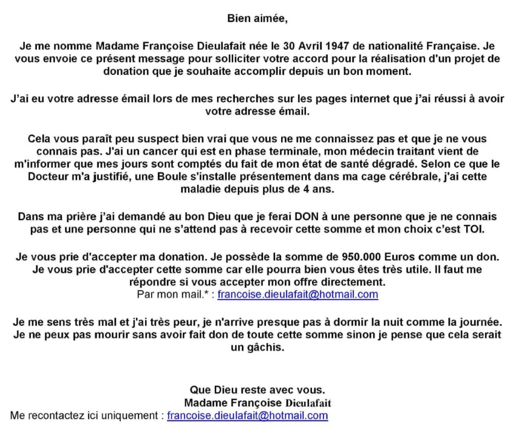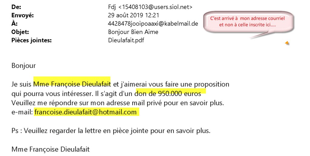 J’ai reçu cette semaine un courriel de Françoise Dieulafait qui dit vouloir me faire un don de 950,000 euros. C’est une grosse somme !