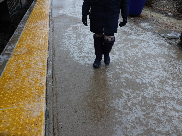 Comment peut-on laisser des passagers marcher sur une allée d’embarquement de train qui a tout l’air d’une patinoire qu’on vient de polir pour la prochaine joute de hockey ?